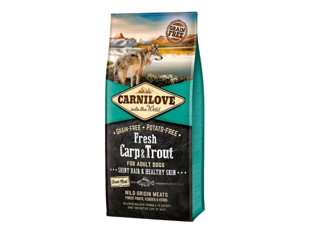 Carnilove Fresh Kapr & Pstruh superprémiové, holistické krmivo bez obilovin a brambor s čerstvým masem pro dospělé psy. Krmivo bylo navrženo s respektem k původní přirozenosti psů tak, aby jim poskytl vyváženou stravu bohatou na čerstvé maso v kombinaci s různými druhy zeleniny, ovoce a bylin